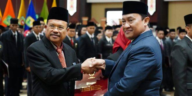 NUSAKALIMANTAN.COM, Palangka Raya – Wakil Gubernur (Wagub) Kalteng Edy Pratowo menyerahkan penghargaan segaligus menyematkan tanda kehormatan pada acara Penganugerahan Tanda Kehormatan Satyalancana Karya Satya Pegawai Negeri Sipil di lingkup Pemerintah Provinsi Kalimantan Tengah Tahun 2023, bertempat di Aula Jayang Tingang, Kantor Gubernur Kalteng, Palangka Raya, Selasa (15/8/2023).