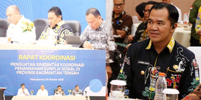 NUSAKALIMANTAN.COM, Palangka Raya – Bupati Pulang Pisau H Ahmad Rifa’i menghadiri dan sekaligus mengikuti rapat koordinasi penguatan sinergitas koordinasi penanganan konflik sosial di Provinsi Kalimantan Tengah yang di laksanakan oleh Kemenkopolhukam RI, bertempat di ruang rapat Hotel Bahalap Palangka Raya, Kamis (30/10/2025).