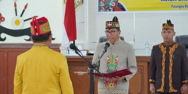 NUSAKALIMANTAN.COM, Palangka Raya – Plt. Sekretaris Daerah Provinsi Kalimantan Tengah yang juga Plt. Ketua Umum Dewan Adat Dayak (DAD) Kota Palangka Raya Leonard S. Ampung menghadiri Pelantikan dan Pengukuhan Damang Kepala Adat Kecamatan Jekan Raya yang digelar di Aula Peteng Karuhei, Kantor Wali Kota Palangka Raya, Jumat (14/11/2025).