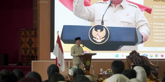 NUSAKALIMANTAN.COM, Palangka Raya – Menteri Perlindungan Pekerja Migran Indonesia (P2MI) Mukhtarudin memberikan kuliah tamu kepada mahasiswa serta civitas akademika Universitas Palangka Raya (UPR) yang berlangsung di Aula Rahan, Jumat (28/11/2025). Kehadiran Menteri P2MI ini menjadi kesempatan bagi UPR untuk memperluas wawasan mahasiswa mengenai peluang dan tantangan kerja di kancah global.