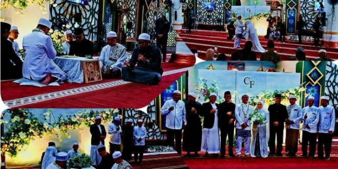NUSAKALIMANTAN.COM, Kuala Kapuas – Guru KH. Mahmud Syarkani Al Banjari dari Kota Balikpapan Provinsi Kalimantan Timur, yang merupakan Qori Internasional pada Minggu (25/1) Pukul 07.40 WIB di Mesjid Agung Al Mukaram Amanah Jalan Tambun Bungai Kuala Kapuas, melantunkan ayat suci Al Qur’an dalam acara pernikahan Putera Puteri dari dua Mantan Camat Kapuas Timur yaitu Novia Cantika Yusar anak dari H Saripudin, S.Kep.,Ners.,MM dan M. Fikran Hakim anak dari Drs. Abdul Hamid