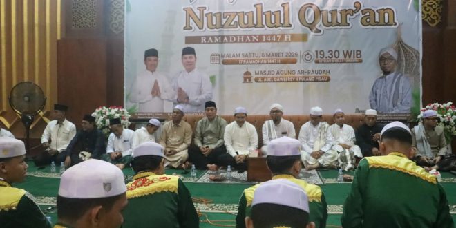 NUSAKALIMANTAN.COM, Pulang Pisau – Suasana khidmat menyelimuti peringatan malam Nuzulul Quran yang digelar di Masjid Agung Ar-Raudhah di Kecamatan Kahayan Hilir, Kabupaten Pulang Pisau, Provinsi Kalimantan Tengah (Kalteng), Jumat (6/3/2026) malam.