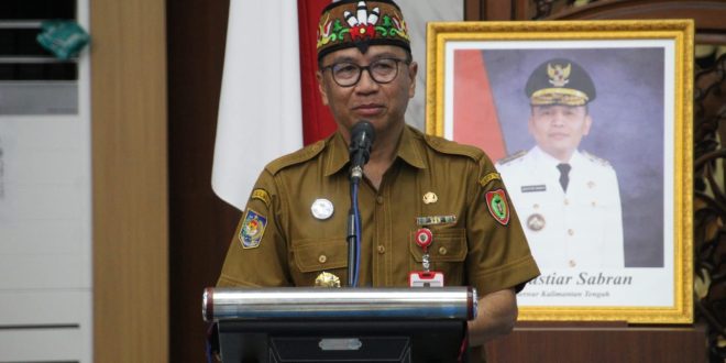 Plt. Sekretaris Daerah Provinsi Kalimantan Tengah, Leonard S. Ampung, saat menyampaikan sambutan pada Rapat Koordinasi Teknis (RAKORTEK) Riset dan Inovasi Daerah Tahun 2026 yang berlangsung di Aula Bapperida Provinsi Kalimantan Tengah, Selasa (31/3/2026).